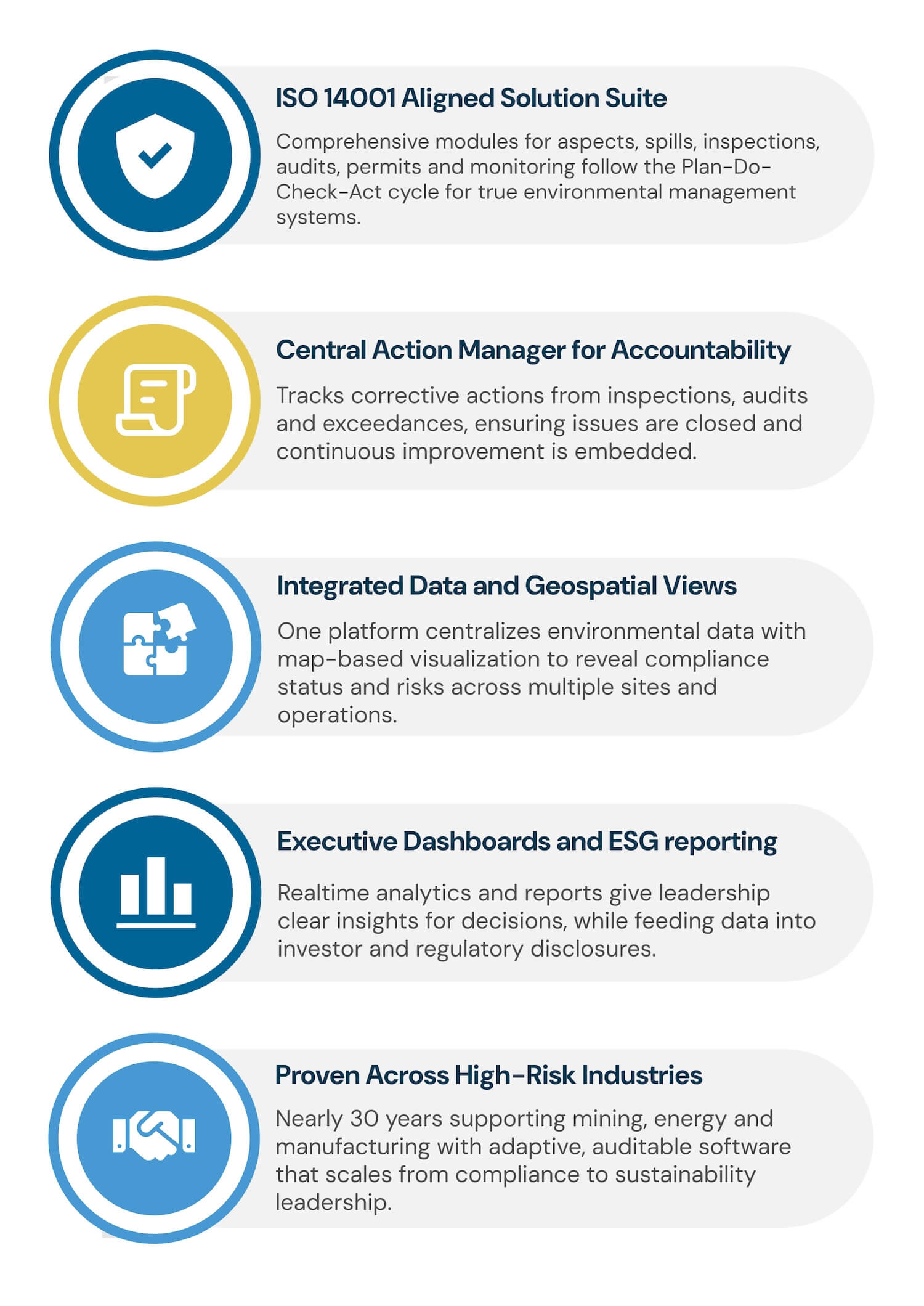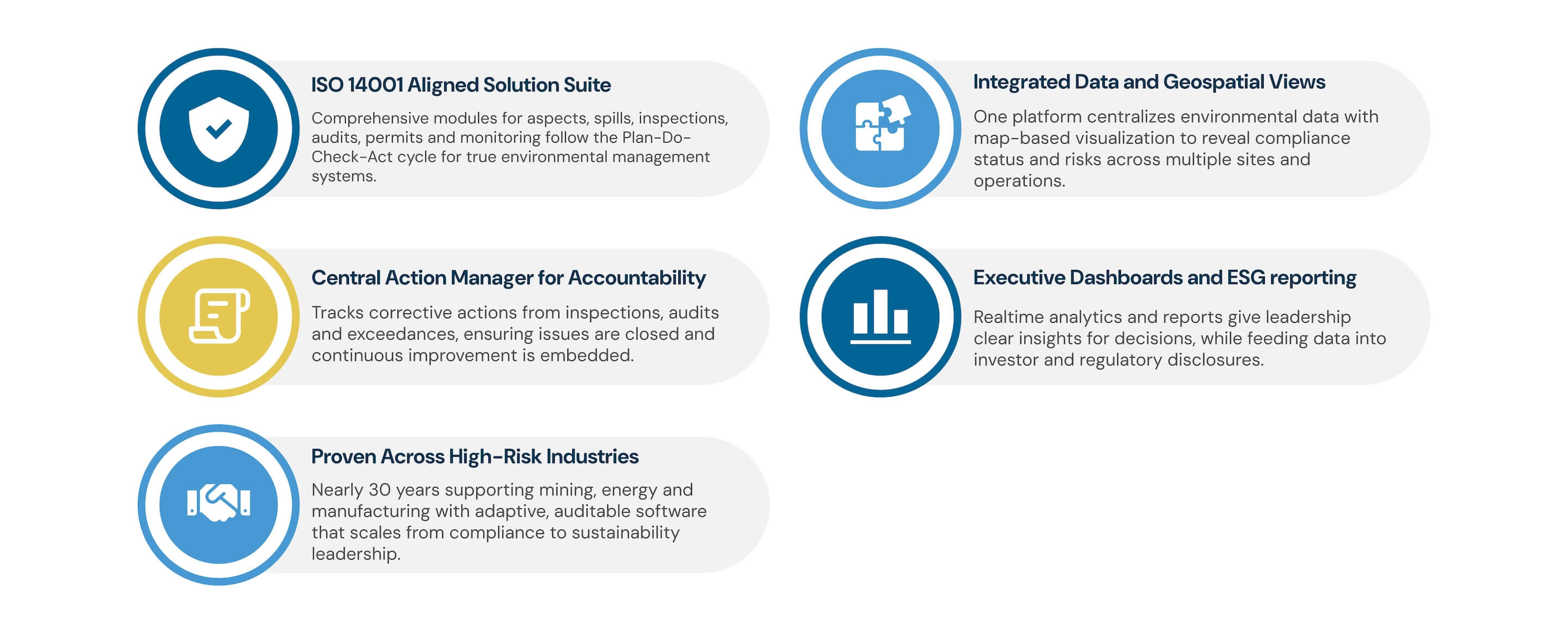 Modules for environmental aspects/impacts, spills/releases, inspections, audits, compliance/permits and monitoring (air, water, waste) follow the Plan-Do-Check-Act framework to drive operational excellence.