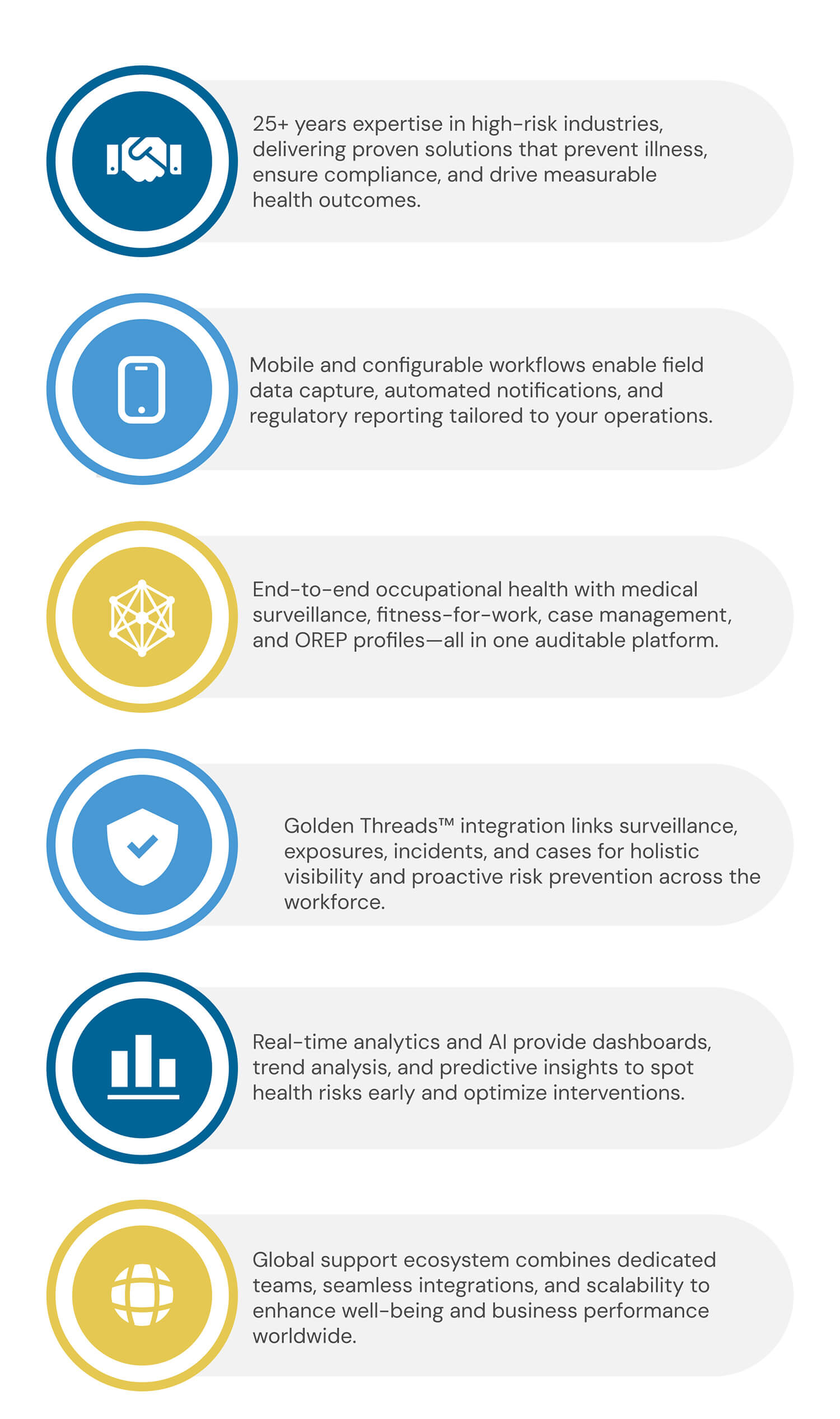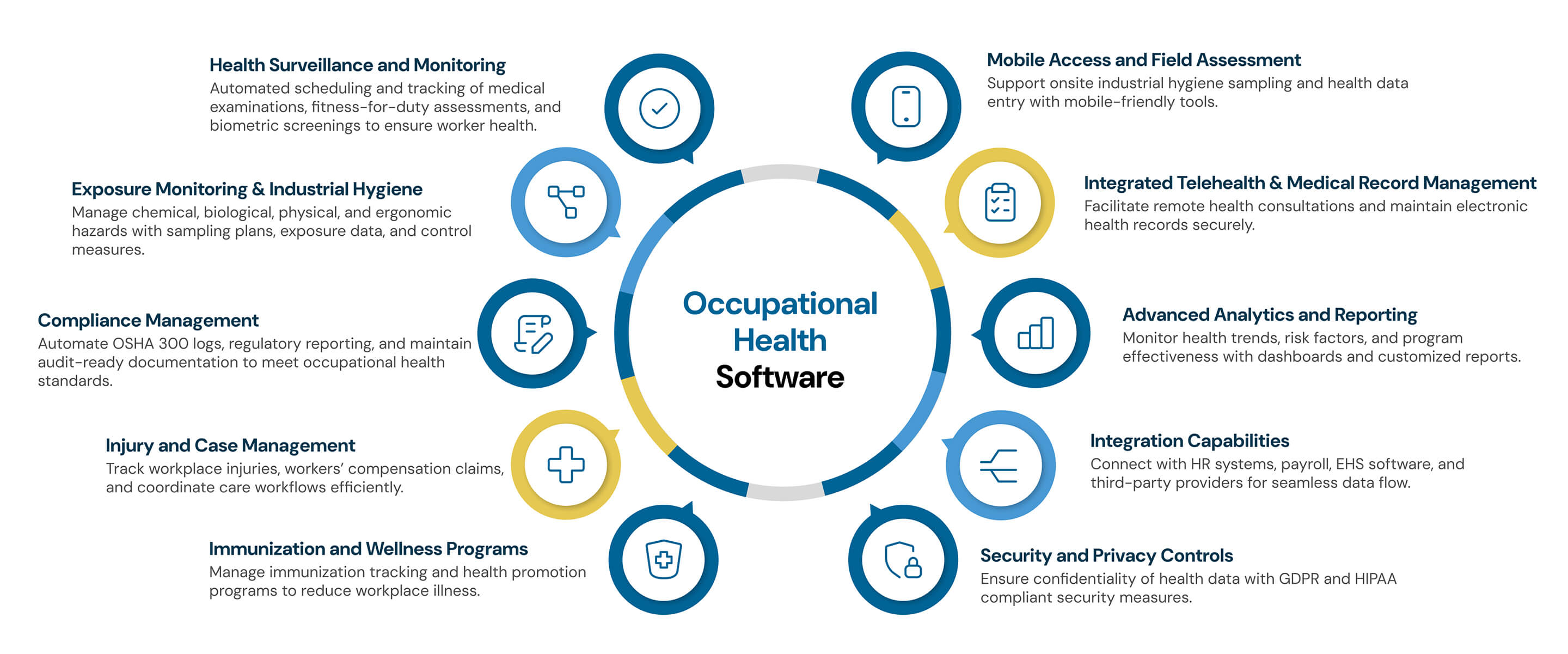 Occupational Health Management software integrates clinical, industrial hygiene, and compliance data, automating workflows to ensure your workforce stays healthy and compliant. From scheduling mandatory health exams to managing chemical exposure and wellness programs, the platform centralizes your occupational health efforts in one secure environment.