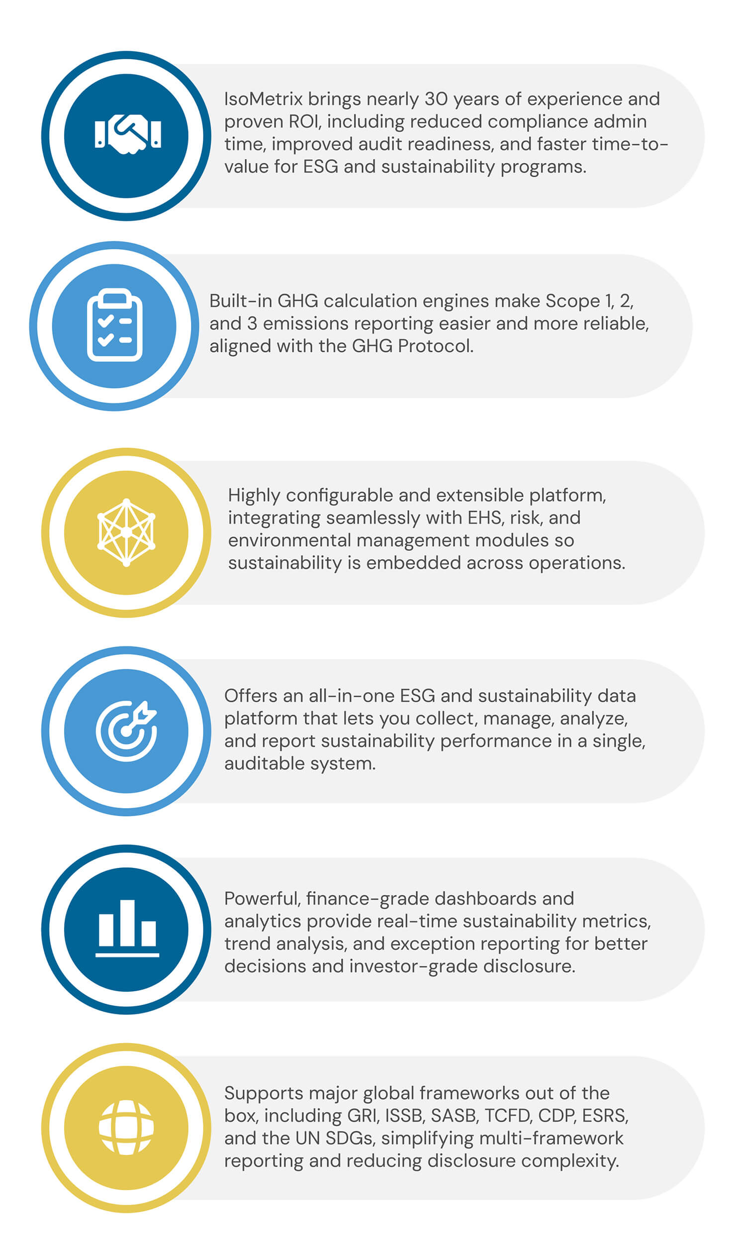 - Facilitate internal controls monitoring and align ESG data with corporate governance frameworks like SASB, TCFD, and UN SDGs.